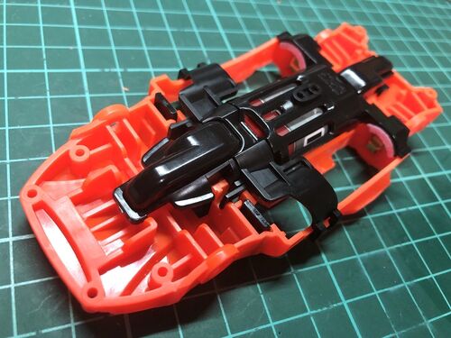ワイド可動バンパーなのでスプレッドバンパーと呼びましょうかね。 (Spread Bumper、なんかhideっぽくていい・・・w) コーナーリング中にバンパーの幅が広がって、105mmを超え、レーンの内側走ることで高速に曲がれる、といった仕組みです。 ただ、前に考察…